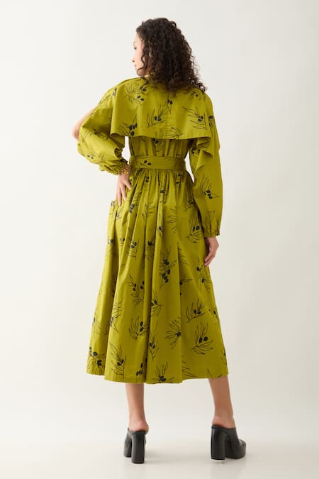 Green Cotton Satin Collared Leaf Aston Midi Dress