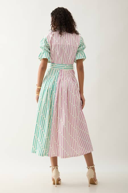 Multi Color Cotton Satin Collared Magnum A-line Dress With Belt