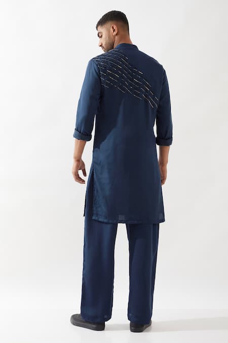 Navy hand embroidered kurta featuring cut dana and bead details. Paired with a loose pyjama with drawstring and side pockets.