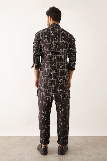 Black kurta featuring grid and floral prints with a lapel collar and full sleeves. Paired with matching trousers for a cohesive look.