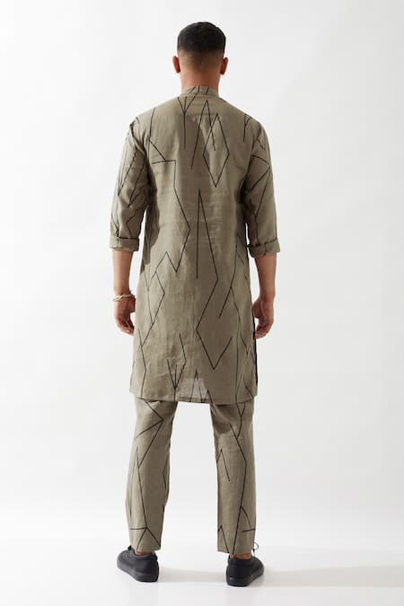 Olive printed kurta featuring a mandarin collar and zipper detail. Paired with matching slim fit semi-elastic trousers with side pockets.