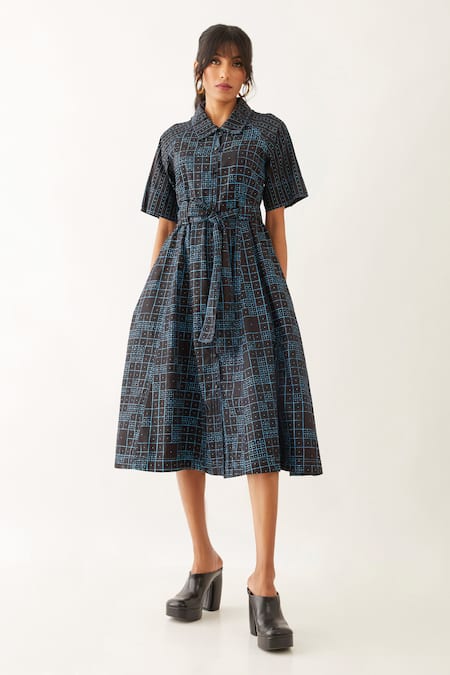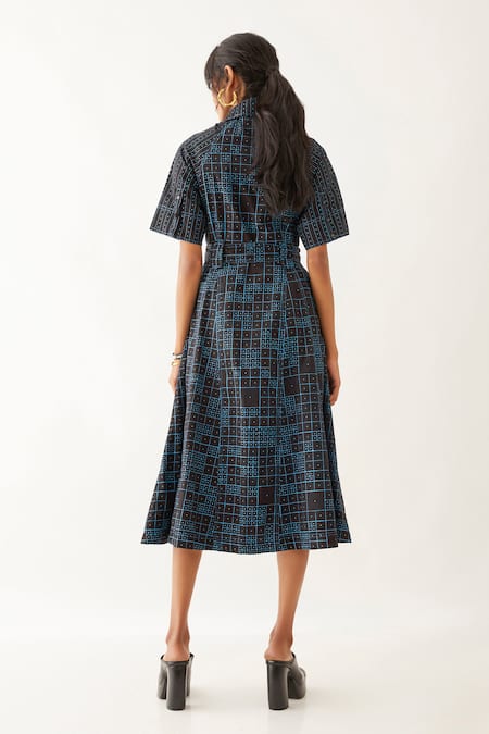 Black midi dress featuring an all-over domino and lanes print with a collared neckline and half sleeves
