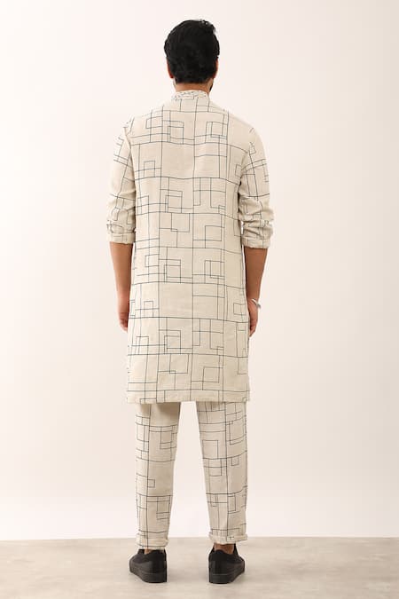 Ivory 100% Linen Print Tartan Pranav Checks Kurta Set