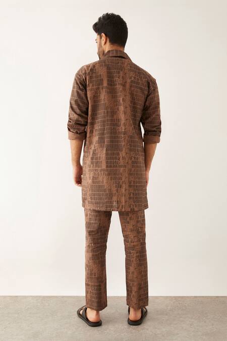 Brown linen shirt featuring a shirt collar and long sleeves with bold flap pockets