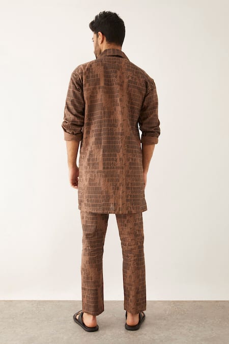 Brown kurta featuring a dominos print with roll-up sleeves and collar neckline. Paired with matching trousers in 100% linen fabric.