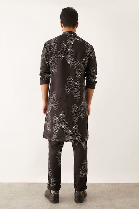 Black kurta featuring a graphic print, band collar, and front zipper closure. Paired with flat front trousers for a complete look.