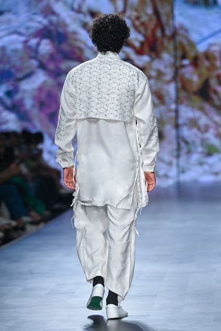 White asymmetric collar kurta featuring stylized panels, printed elbow patch, and printed back panel. Paired with a stylized trouser for a complete look.