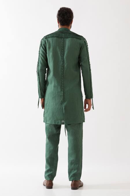 Green kurta featuring full sleeves with pleated fringe detailing. Paired with matching trousers for a complete look.