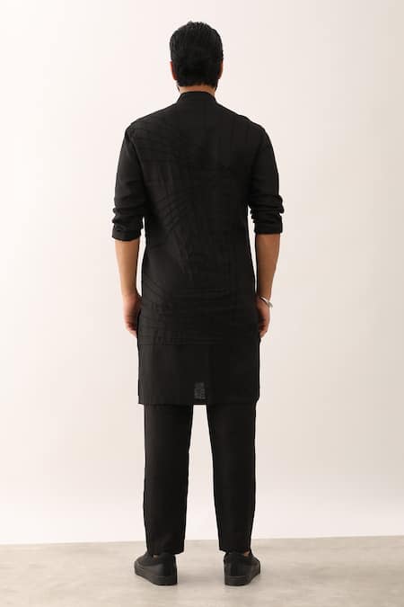Black linen shirt featuring a solid fabric base with a shirt collar and full sleeves. Paired with matching black pants for a cohesive look.