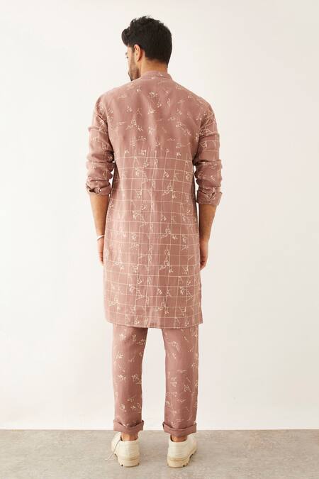 Mauve kurta featuring a band collar, roll-up sleeves, and front button closure. Paired with matching trousers, both crafted from 100% linen with grid and floral prints.