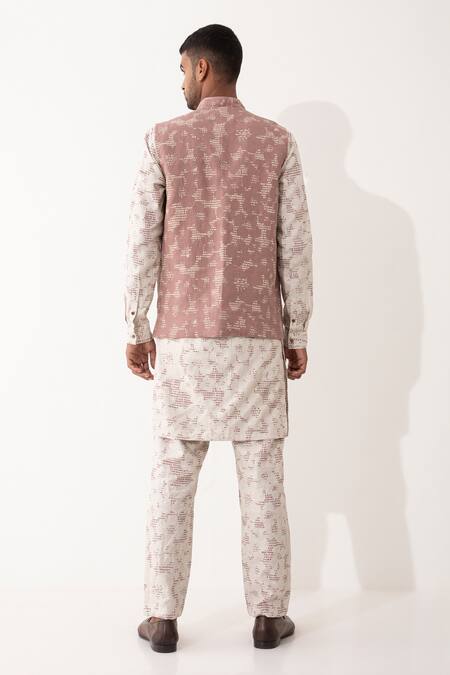 Mauve linen bundi featuring a polka dots print and front button closure. Set includes a matching kurta and pant for a coordinated look.