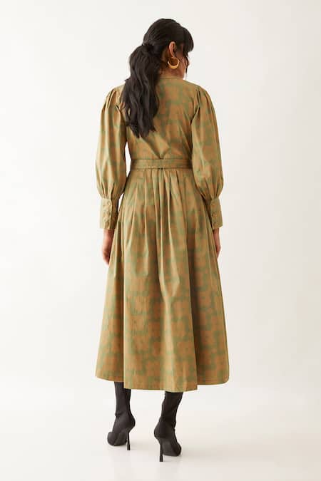 Green Cotton Satin Print Flora V-neck Zeba Pleated Dress