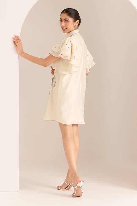 Ivory chanderi shirt dress featuring a stand collar and ruffle sleeves