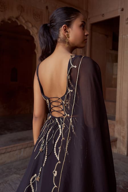 Black Silk, Organza Tassels, Embroidery Scoop Neck Dori Lehenga Set