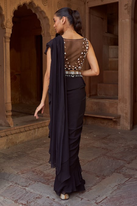 Black pre-draped ruffle saree featuring an embroidered padded blouse with loop detailing on the neckline. Accompanied by an embroidered belt to enhance the silhouette.