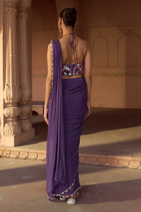 Purple Persian Art Embroidered Blouse With Scallop Border Pre-draped Saree
