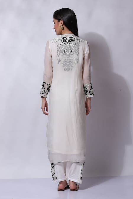 White kurta featuring aari hand embroidery and patchwork. Paired with a longline jacket and pant, it includes attached viscose lining and a hook & eye closure.