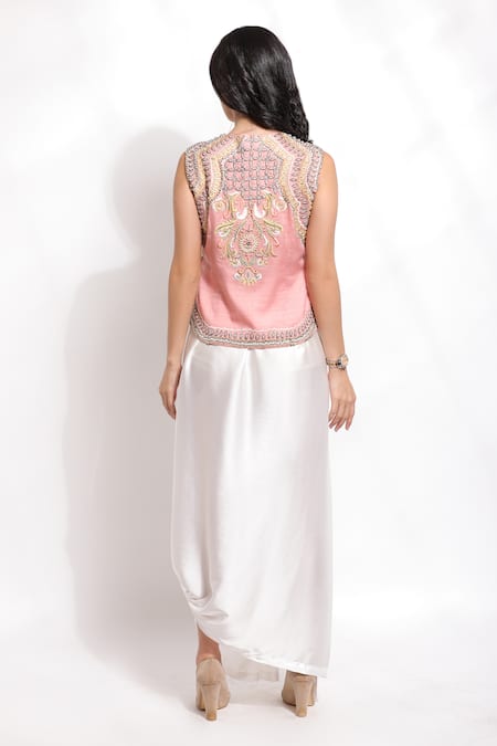 Peach hand embroidered jacket featuring round neck, sleeveless design, and intricate zari, pearl, thread, and sequin work. Paired with a white pleated draped skirt with knotted details.