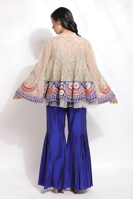 Ecru woven silk peplum jacket featuring bell sleeves with multi-color chevron and vintage pattern thread embroidery. Paired with a blue pleated sharara and V neck all-over embroidered bustier.