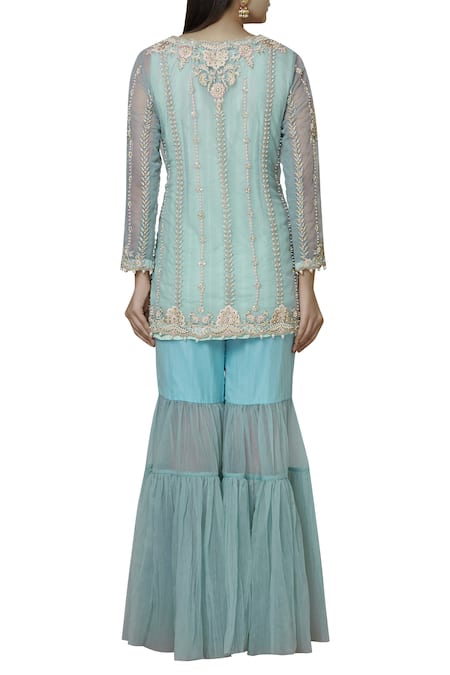 Blue kurta with all-over floral motif work paired with inner slip. Comes with tiered sharara pants & plain dupatta.