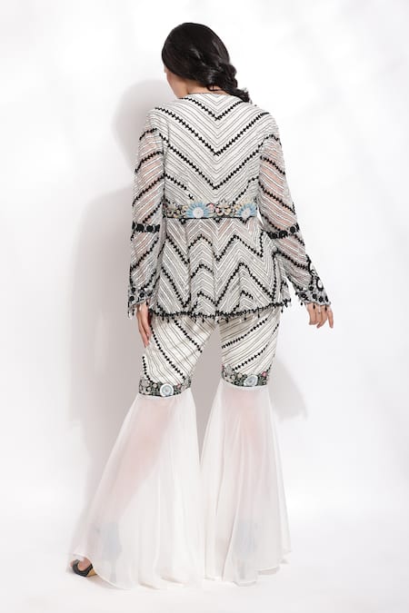 White hand embroidered peplum kurta featuring dori, pearl, and zari work with floral patterns and 3D flowers. Paired with an embroidered sharara with a crystal drop tassel hem.