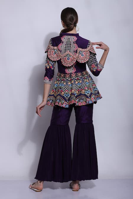 Purple Silk Hand Embroidered Chikankari V Peplum Kurta And Sharara Set