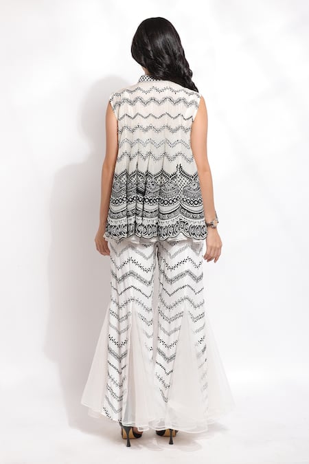 Off white sharara set featuring a sweetheart neck bustier and an open jacket. The ensemble includes hand embroidered details with Aari & thread work and a ruffle hem on the jacket.