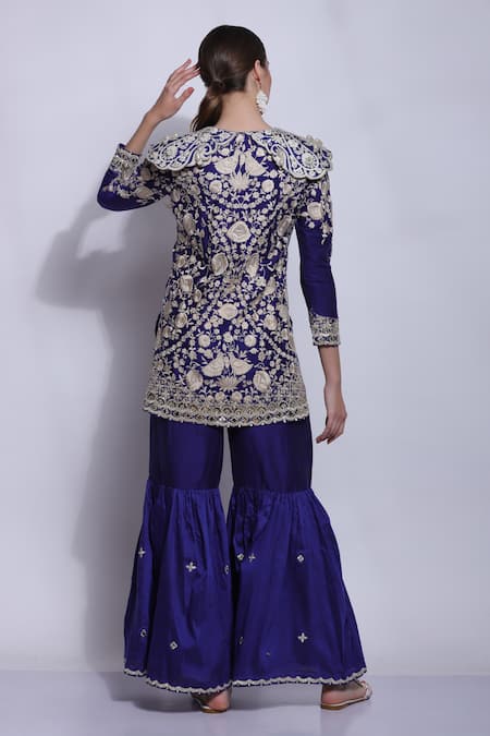 Blue kurta featuring round neckline, three-quarter sleeves, and chikankari parsi embroidery. Paired with a matching sharara, it showcases a high-low hem design.