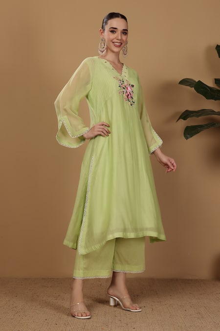 Lime Embroidery V-neck Hand Chanderi Kurta Set