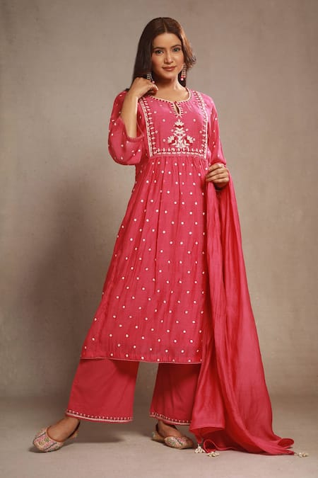 Rani pink kurta featuring hand embroidery and a round neckline. Paired with matching pants and a dupatta.