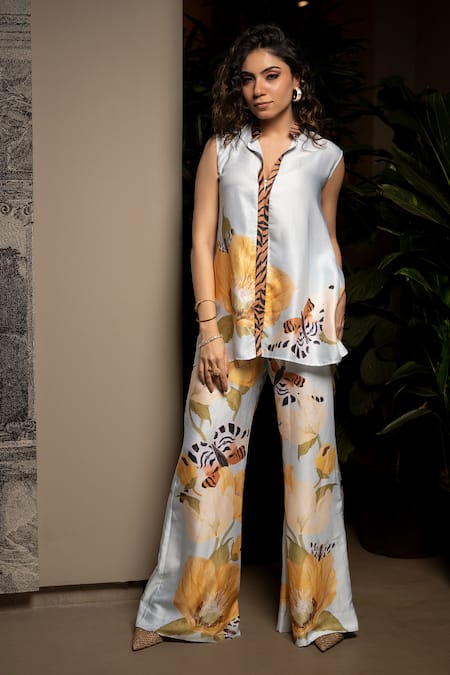 Buy_Sonam Parmar Jhawar_Blue Crepe Blend Printed Floral Collared Shirt And Pant Set_Online_at_Aza_Fashions