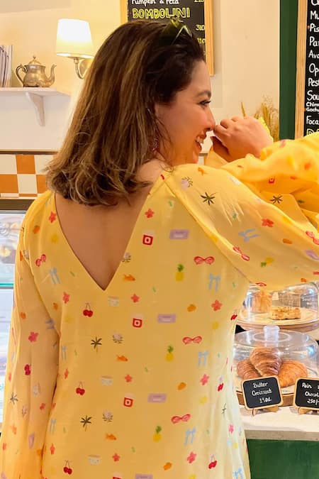 Shop_Sonam Parmar Jhawar_Yellow Crepe Keyhole Neck Designer Dress_Online_at_Aza_Fashions