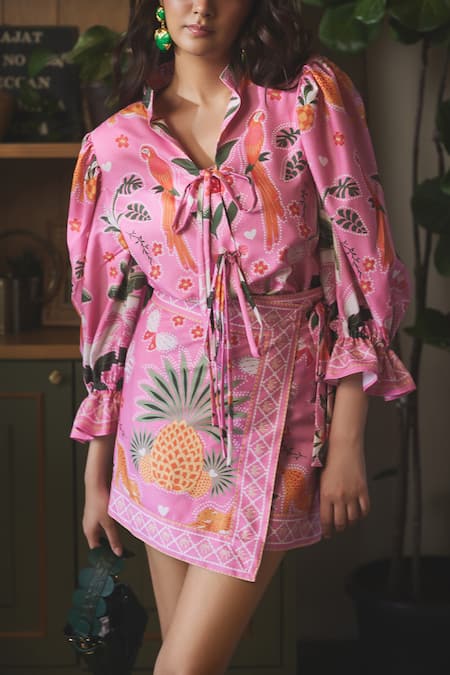 Pink linen shirt featuring a paradise print with puffed sleeves and front tie-ups. Paired with a wrap-around skirt showcasing a vibrant pineapple design.