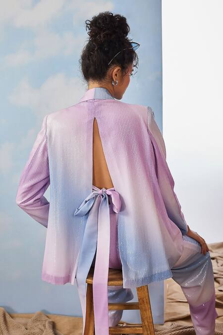 Purple chiffon blazer featuring swish print, water sequins embroidery, and back tie-up detailing. Paired with matching pants for a complete look.