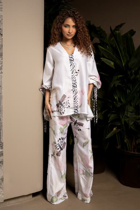 White Crepe Blend Blunt V Floral Print Tie-up Shirt And Pant Set