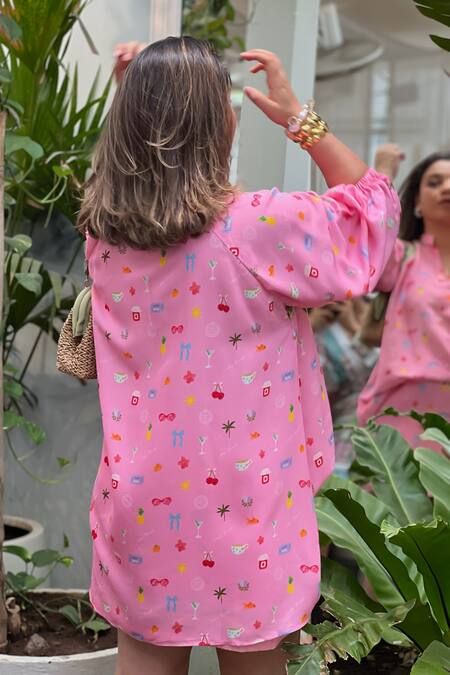 Pink designer top featuring a relaxed fit with playful motifs. Paired with a matching skirt that complements the top's design.