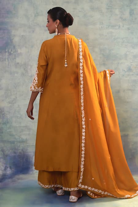 Mustard suit featuring floral and sequin hand embroidery with slit detailing on the sleeves. Paired with a coordinating palazzo and cutwork border dupatta.