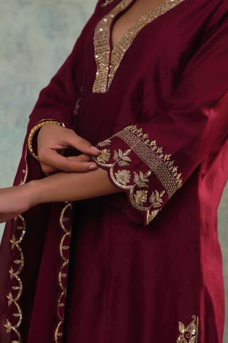 Maroon Anarkali featuring three fourth scallop hem sleeves, V neckline, and dahlia sequin embroidery. Paired with matching flared embroidered hem palazzo and scallop hem organza dupatta.