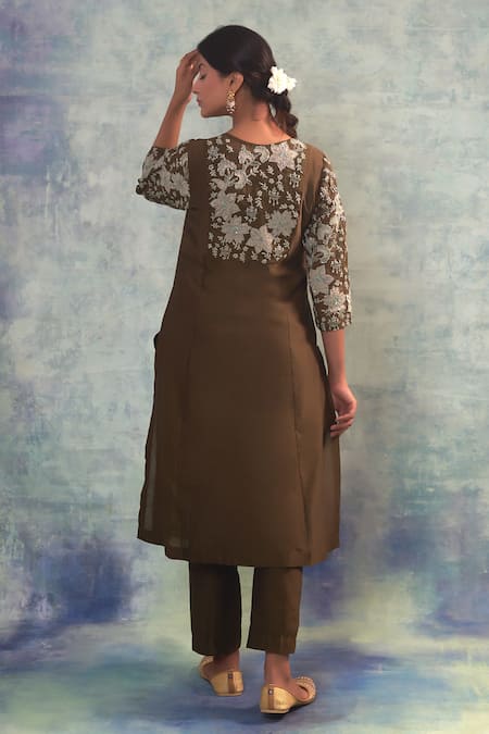 Green kurta featuring floral and sequin hand embroidery with a V neck and three-quarter sleeves. Paired with a pant and inner made from summer silk.