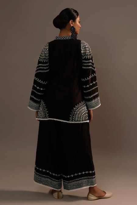 Black Silk Sequins, Lace Collared Enchanting Umbra Work Shirt With Palazzo