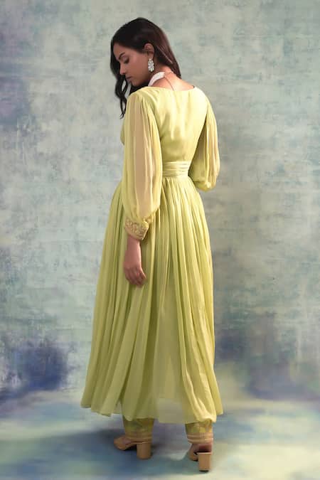 Green kurta featuring floral hand embroidery on the sleeves with all over gathers. Paired with a silk pant that complements the kurta's design.