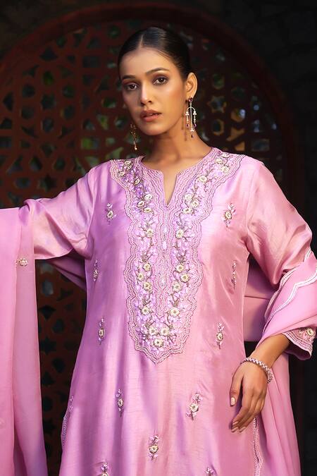 Pink kurta featuring intricate floral garden embroidery with resham, cutdana, zari, pearl, and sequin work. Paired with matching pant and scallop trimmed organza dupatta.