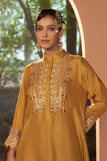 Yellow high low kurta featuring resham, sequin, cutdana and pearl embroidery. Paired with matching pants, both crafted from Dola Silk with attached lining.