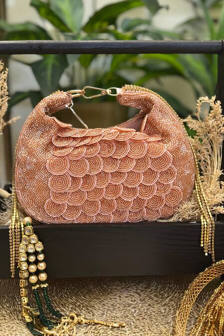 Rose gold clutch featuring intricate bead embellishment in a fish scale pattern. Designed with a zipper and lobster clasp closure for security.