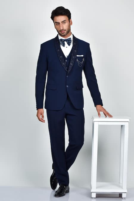 Navy tuxedo featuring full sleeves and shawl collar with cutdana embroidery. Paired with a matching waistcoat, shirt, pant, and bow tie.