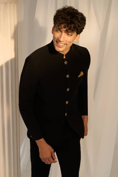 Black velvet bandhgala jacket featuring carved antique buttons. Paired with matching black pant for a complete look.