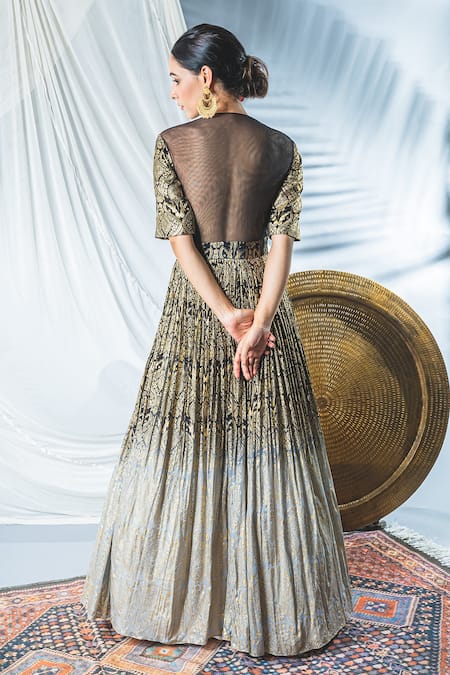 Black ombre anarkali with foil print and embellishment on the neckline. Comes with dupatta.