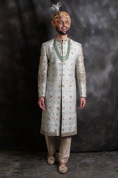 Duckegg blue sherwani with floral embroidered motifs. Paired with kurta & pant.
