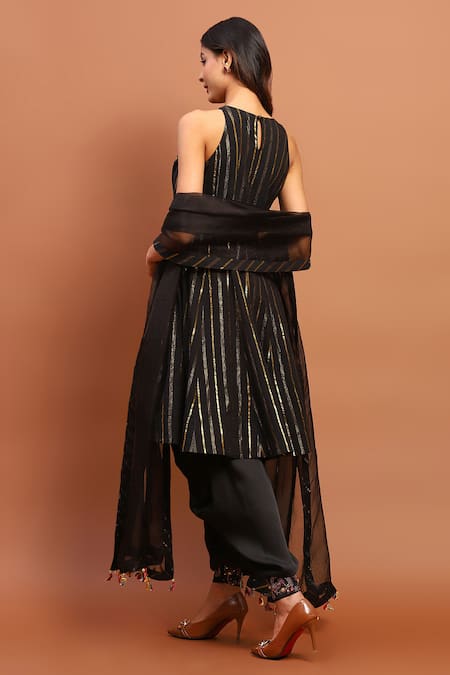 Black georgette short anarkali featuring an all-over stripe pattern with a hand embroidered yoke adorned with contrast sequin, cut dana, zari, and bead work. Paired with a salwar featuring an embroidered border and a dupatta with a fringe tasselled hem.