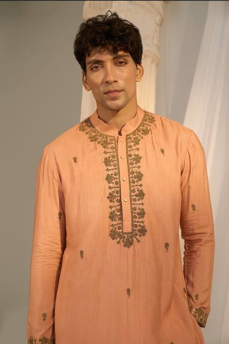 Orange kurta featuring floral embroidery on the placket, cuffs, and scattered buttis. Paired with a contrasting pyjama pant that includes side pockets.